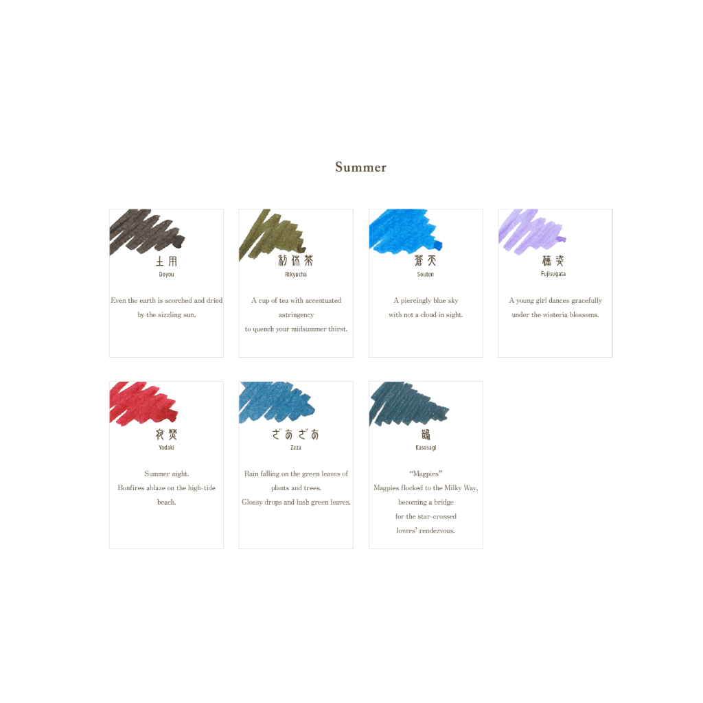 SHIKIORI หมึกได้รับแรงบันดาลใจจากการเปลี่ยนแปลงอย่างค่อยเป็นค่อยไปของพืชและต้นไม้ ดอกไม้ แห่งฤดูกาลทั้ง 4 อย่าง Spring, Summer, Autunm และ Winter มาสร้างสรรค์เป็นสีหมึกที่มีความสวยงามเป็นเอกลักษณ์